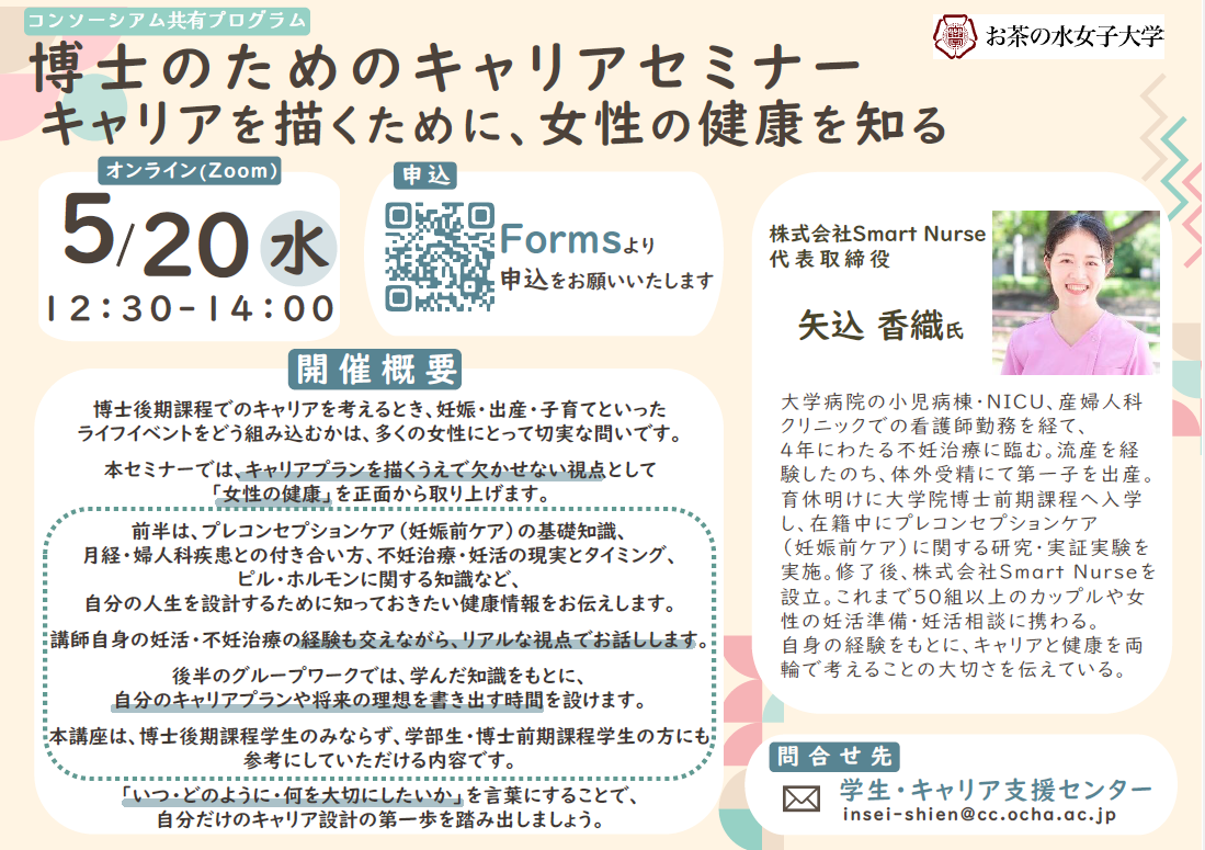 「博士のためのキャリアセミナー~キャリアを描くために、女性の健康を知る」(お茶の水女子大学)