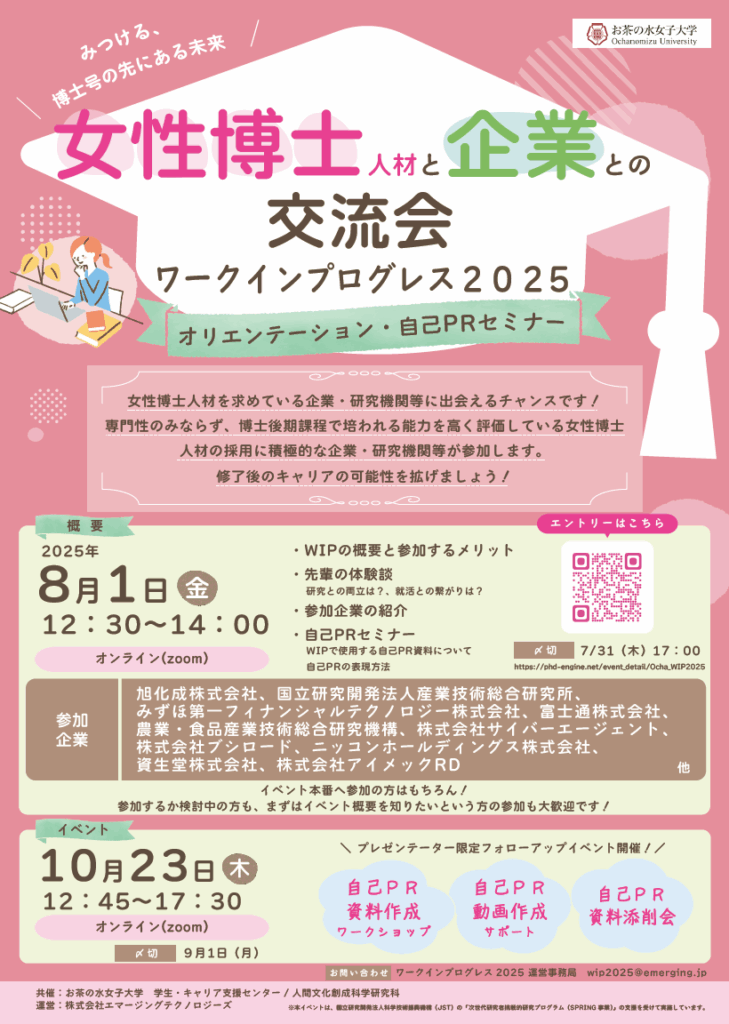 ①本学主催だから可能な「女性博士人材」を求めている企業・研究機関等と出会える。