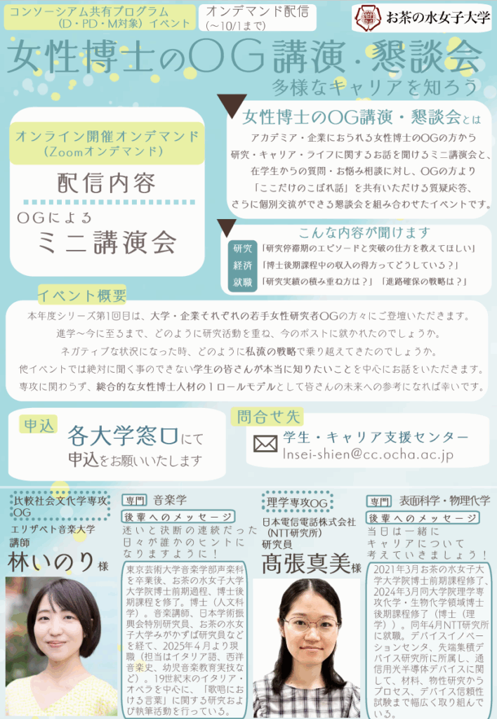 対象者 | コンソーシアム内の大学院生(MC, DC)、博士研究員(PD)、 博士進学を視野に入れている学部生、教職員 ※オンデマンド配信では、男子学生・男性教職員もご視聴いただけます。 ※教職員の方も、是非ご視聴ください。 |