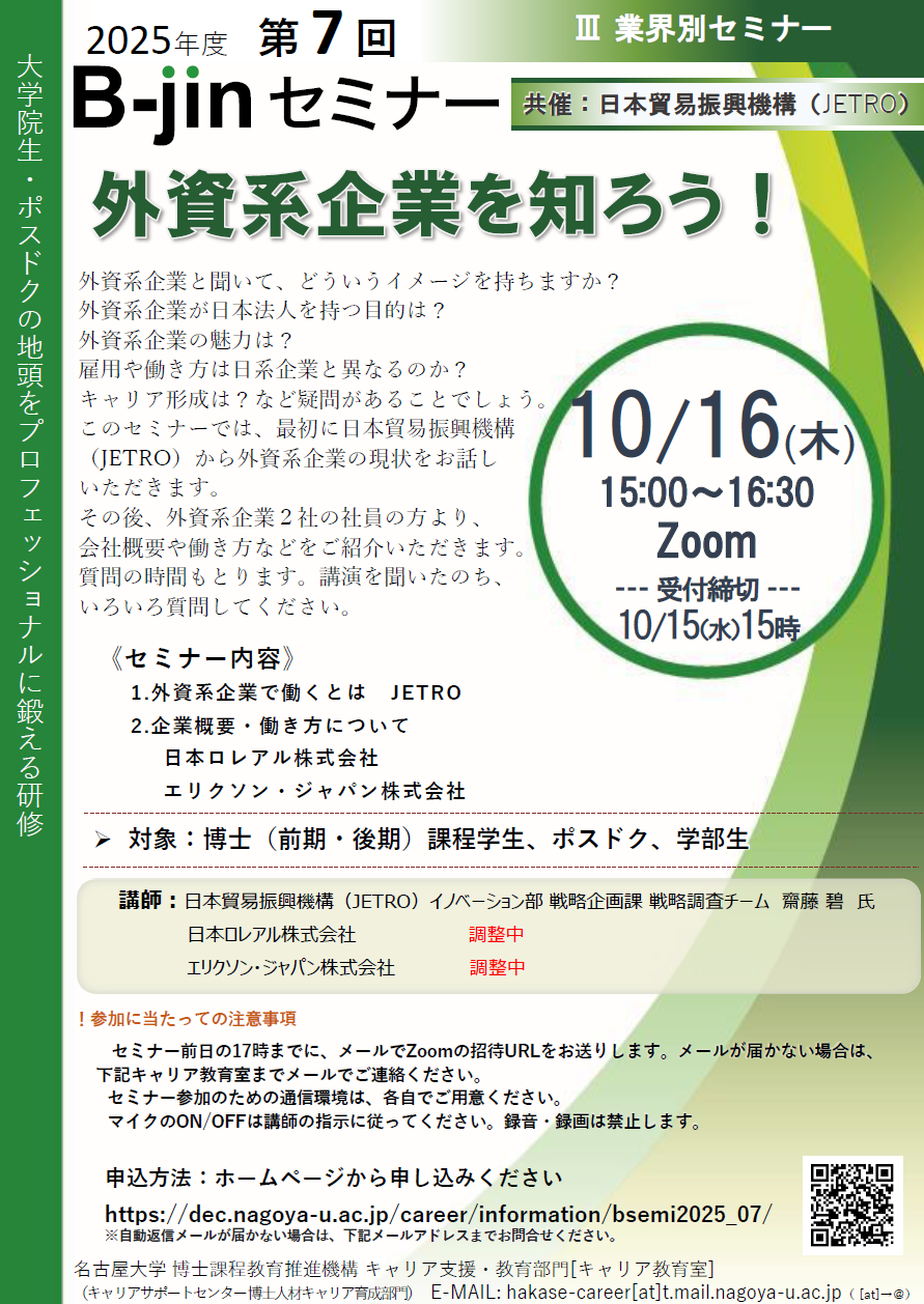 申込方法 | 以下のフォームからお申込みください。 https://dec.nagoya-u.ac.jp/career/information/bsemi2025_07/ |