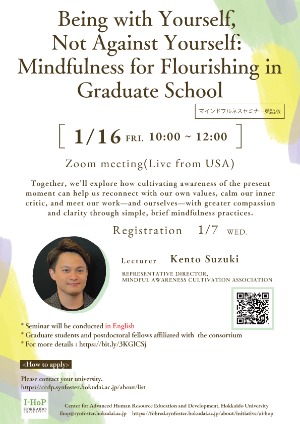 Being with Yourself, Not Against Yourself: Mindfulness for Flourishing in Graduate School【マインドフルネスセミナー英語版】(Hokkaido University)