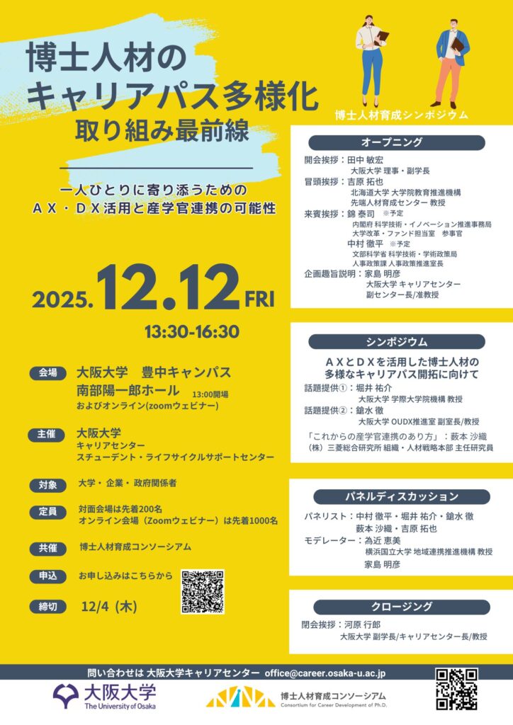 | プログラム | 13:00-13:30 受付 総合司会 弥富洋子(新潟大学 大学院教育支援機構 PhDリクルート室 特任教授) 13:30-13:40 開会挨拶 田中敏宏(大阪大学 理事・副学長) 冒頭挨拶 吉原拓也(北海道大学 大学院教育推進機構 先端人材育成センター 教授) 来賓挨拶 錦 泰司(内閣府 科学技術・イノベーション推進事務局 大学改革・ファンド担当室 参事官) ※予定 来賓挨拶 中村徹平(文部科学省 科学技術・学術政策局 人材政策課 人材政策推進室 室長) ※予定 13:40-13:45 企画趣旨説明 家島明彦(大阪大学 キャリアセンター 副センター長/准教授) 13:45-15:15 シンポジウム 「AXとDXを活用した博士人材の多様なキャリアパス開拓に向けて」 13:45-14:10 話題提供1 「大阪大学の実情:博士人材の多様なキャリアパス開拓を目的とした、AI活用履修シミュレーターおよび アカデミック・アドバイジングによる学際的な学びの推進プロジェクト」 堀井祐介(大阪大学 学際大学院機構 教授) 14:10-14:35 話題提供2 「大阪大学のDX:ひとりひとりの博士人材の人生に寄り添うOUID・OU人財データプラットフォーム 」 鎗水 徹(大阪大学 OUDX推進室 副室長/教授) 14:35-15:15 論点整理 「これからの産学官連携の在り方」 薮本沙織(株式会社三菱総合研究所 組織・人材戦略本部 政策研究・コンサルティンググループ (兼 未来共創グループ) 主任研究員) 15:15-15:25 休憩(15分) 15:30-16:30 パネルディスカッション ※質疑応答を含む全体討論 参加者全員 【パネリスト】 堀井祐介(大阪大学 学際大学院機構 教授) 鎗水 徹(大阪大学 OUDX推進室 副室長/教授) 薮本沙織(株式会社三菱総合研究所 組織・人材戦略本部 主任研究員) 吉原拓也(北海道大学 大学院教育推進機構 先端人材育成センター 教授) 中村徹平(文部科学省 科学技術・学術政策局 人材政策課 人材政策推進室 室長) 【モデレーター】 為近恵美(横浜国立大学 地域連携推進機構 教授) 家島明彦(大阪大学 キャリアセンター 副センター長/准教授) 16:30 閉会挨拶 河原行郎(大阪大学 副学長/キャリアセンター長/教授) 17:00-19:00 情報交換会 乾杯 村上正行(大阪大学 スチューデント・ライフサイクルサポートセンター センター長/教授)  |